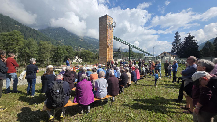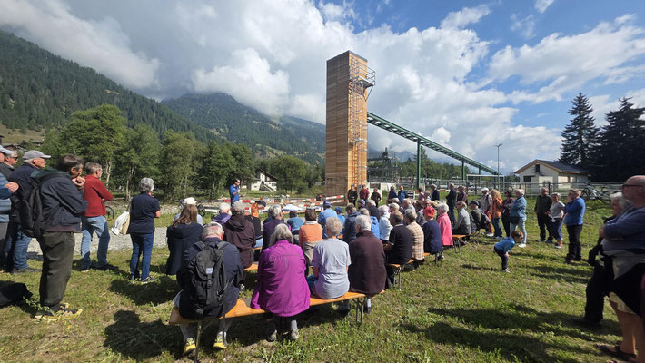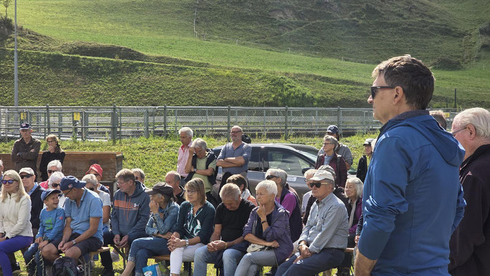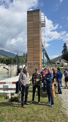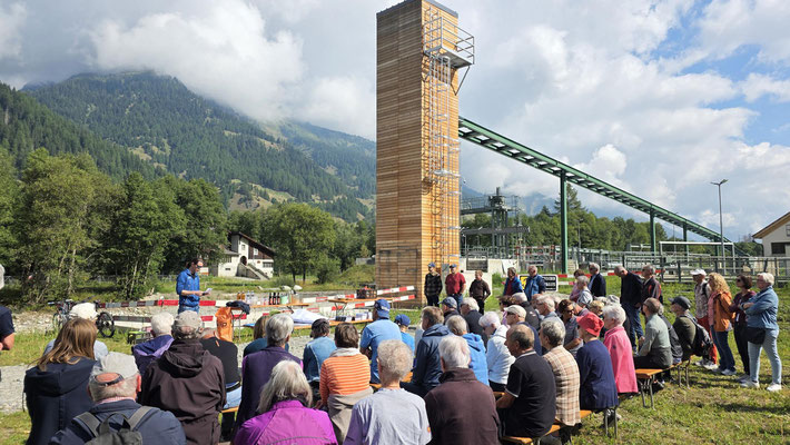 So eine Lockströmung hat schon etwas sehr Besonders an sich. Am Fischlift von Gluringen wird sie den Fischen bald den richtigen Weg über das Rhonewehr weisen. Von der Lockströmung angezogen, klettern die Fische zuerst eine Fischtreppe hoch. Oben, bei der Etage des Lifts angekommen, werden sie von einer Videokamera detektiert. Die Türe des Fahrstuhls nach oben öffnet sich, so dass die Fische in den Lift schwimmen können. Alle 2 Stunden fährt der Fahrstuhl 10 m hoch. Oben öffnet sich die Ausgangstüre des Lifts und lässt die Fische durch ein dickes Rohr hinunter bis hinter das Wehr gleiten. Und für die Fische, die den Weg von oben nach unten suchen, gibt es eine bequeme Wasserrutschbahn. Ein wahrer Aquapark für Fische! Und nochmals: So eine Lockströmung hat schon etwas sehr Besonderes an sich. Wie anders ist es zu erklären, dass wir mit unserem heutigen Besuchstag mehr als hundert Personen zum Fischlift locken konnten? Bestimmt hat unser Vortrag über die Fischwanderung dazu beigetragen. Bestimmt auch der spannende Vortrag der Forces Motrices Valaisannes (FMV) zur Funktion des Lifts, die Führung durch das Werk und bestimmt auch der feine Abschluss-Apero.